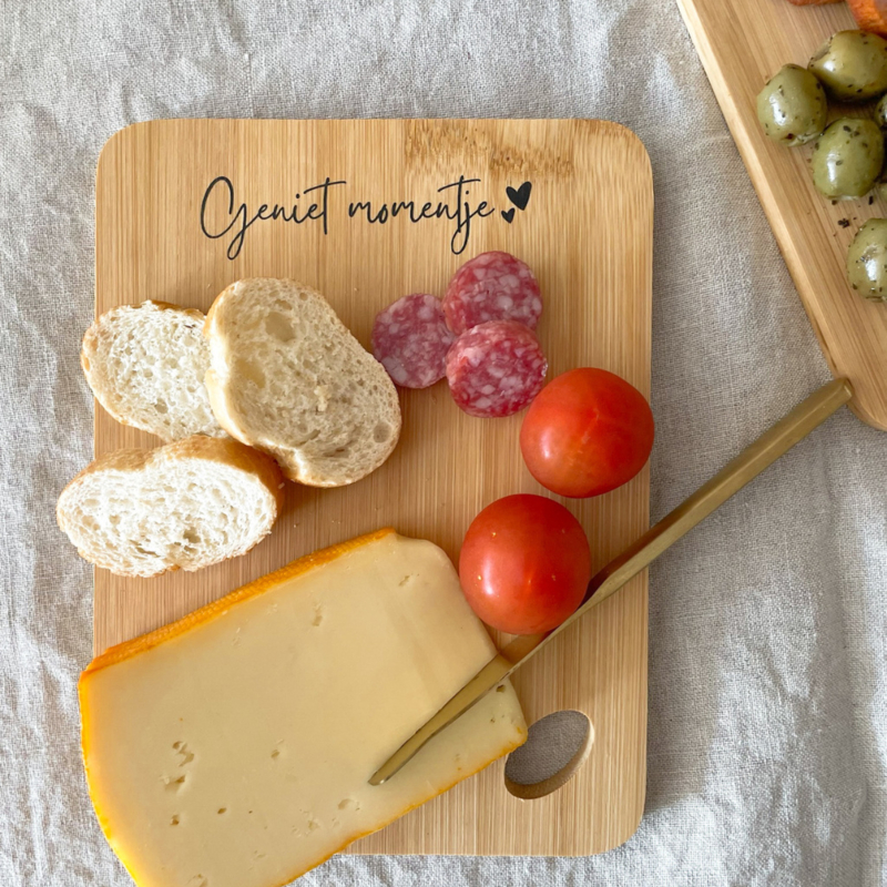 Zoek je een origineel cadeautje met betekenis? Deze compacte serveerplank met de gegraveerde tekst Geniet Momentje is hét perfecte gebaar voor elke gelegenheid. Of het nu gaat om een bedankje, verjaardag, of zomaar een verwenmoment dit plankje tovert gegarandeerd een glimlach op iemands gezicht.