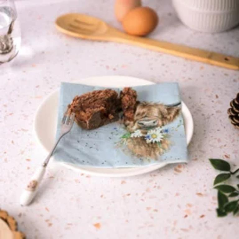 Vrolijk je tafelsetting op met de charmante ‘Daisy Coo’ lunchservetten van Wrendale Designs. Deze hoogwaardige 3-laags papieren servetten zijn versierd met een prachtige illustratie van een schotse hooglander met madeliefjes in de bek – perfect voor feestjes, picknicks of een gezellige high tea.