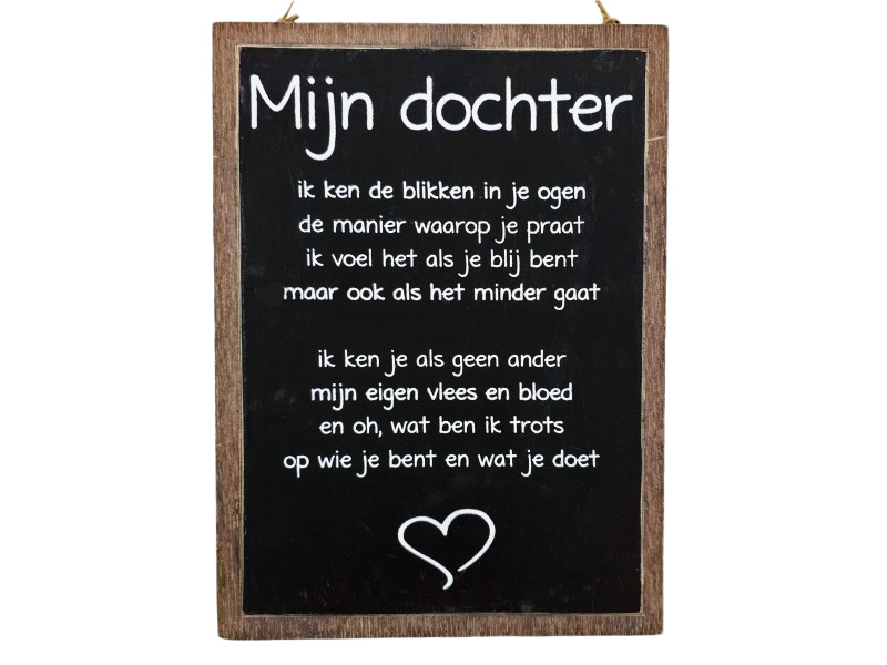 Dit prachtige houten tekstbord “Mijn dochter” is een ontroerend eerbetoon aan de bijzondere band tussen ouder en kind. De warme woorden raken precies dat gevoel dat soms moeilijk uit te spreken is – liefde, trots en verbondenheid.