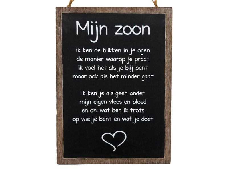 Dit houten tekstbord “Mijn zoon” verwoordt op een prachtige manier de diepe band tussen ouder en kind. De woorden raken, geven erkenning en laten zien hoeveel trots en liefde er is – precies zoals het hoort.