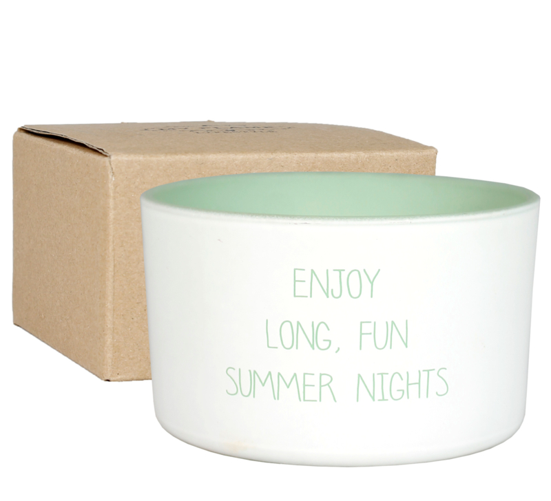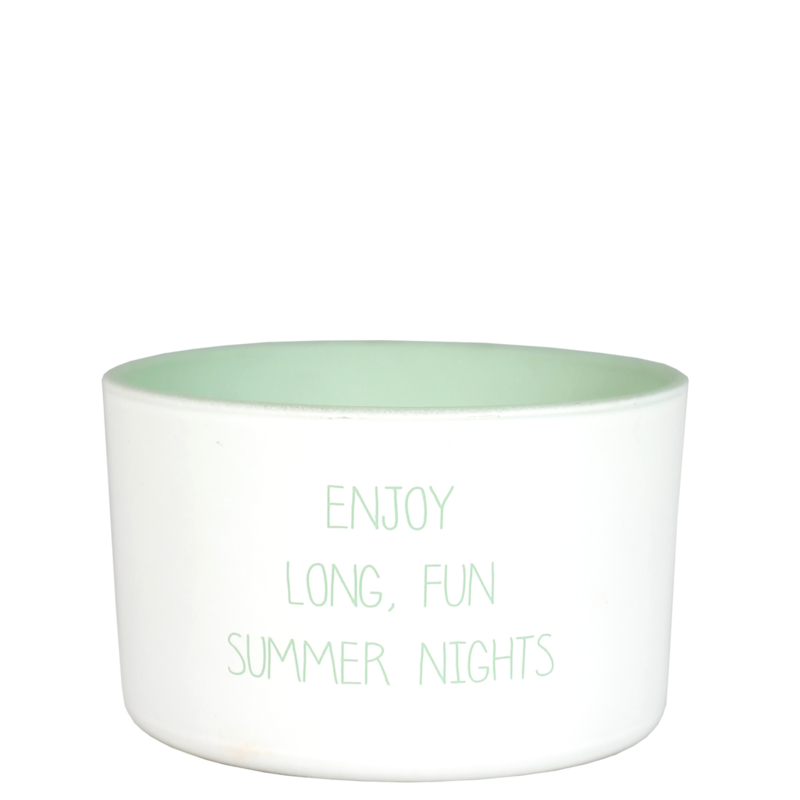 Op het witte glazen potje met groene binnenzijde staat de tekst in groene letters:: Enjoy long fun summer nights – een vrolijke reminder om te genieten van het moment.