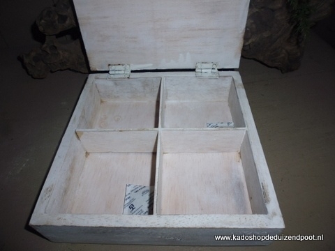 Artikelnummer: 1609 OverzichtHouten theedoos 4 vaks scharnierend met tekst