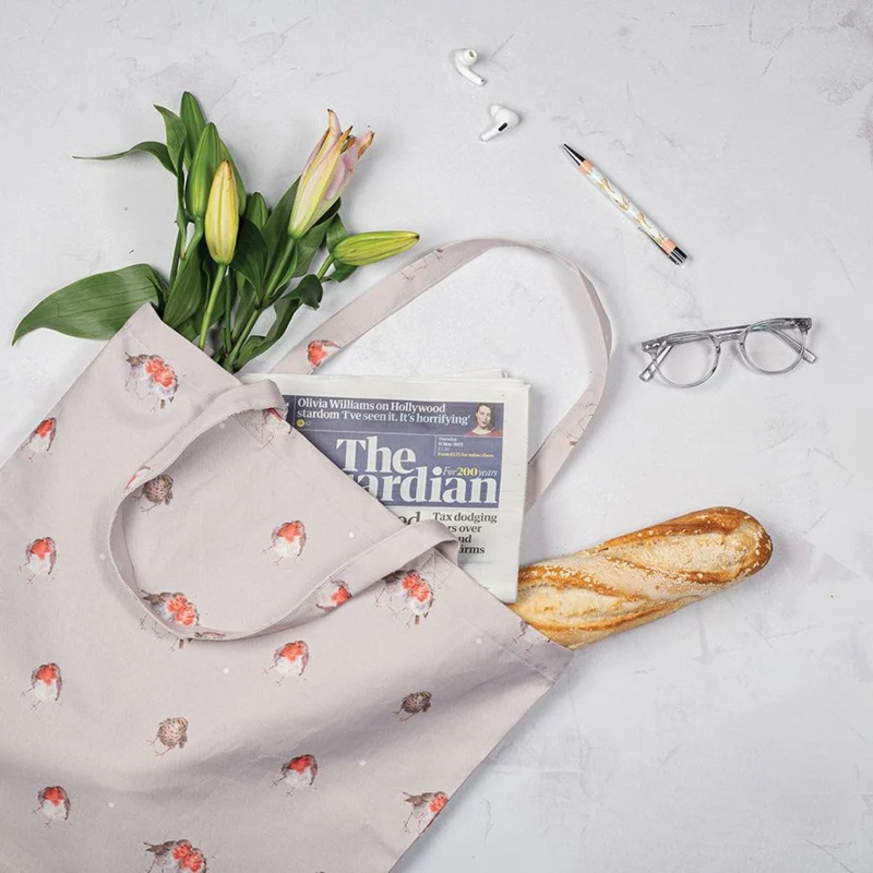 Deze opvouwbare boodschappentas van Wrendale Designs met het ontwerp ‘Jolly Robin’ is ideaal voor boodschappen of dagelijks gebruik.