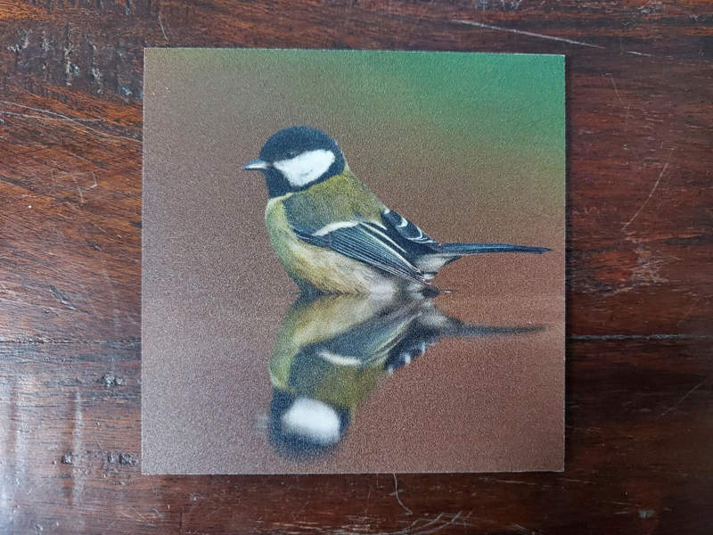 De koolmees op deze onderzetter neemt een verfrissend bad in de waterplas. Daardoor heeft hij helemaal niet in de gaten dat hij vanuit de vogelkijkhut op de foto wort gezet. De weerspiegeling van het water zorgt voor een mooi spiegelbeeld van het koolmeesje.