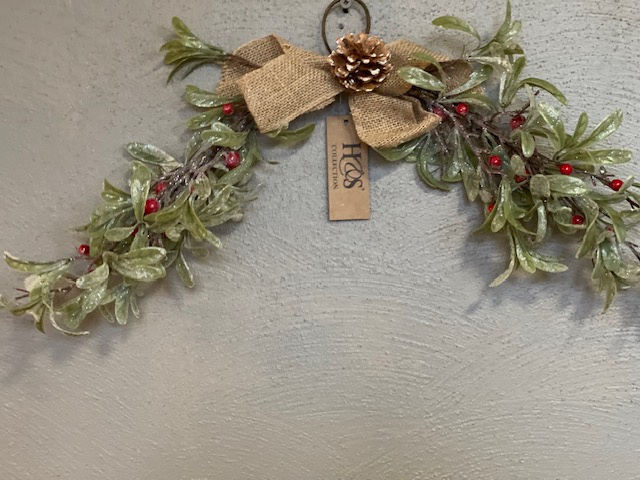 Decoreer je huis tijdens de feestdagen met deze hangende kersttak! De kersttak, met het uiterlijk van een Sneeuwbes, is gemaakt van kuststof en in het midden voorzien van een jute strik met dennenappel. De takken worden ondersteund door een stevige metalen draad, die in het midden ook een handig bevestigingsoog heeft. Hang hem daarmee aan de schouw, deur of kast voor een mooi geheel. De kersttak is ca. 75cm lang en naar wens in vorm te vouwen. De bladeren van de sneeuwbes zijn smal en ovaalvormig en voorzien van een glitter sneeuwlaagje.