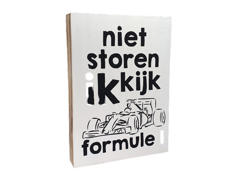 Een stoer houten tekstblok in wit-zwart met de tekst “Niet storen ik kijk Formule 1”. Perfect voor racefans die tijdens de Grand Prix ongestoord willen genieten. Leuk voor op tafel, de kast of in de mancave.