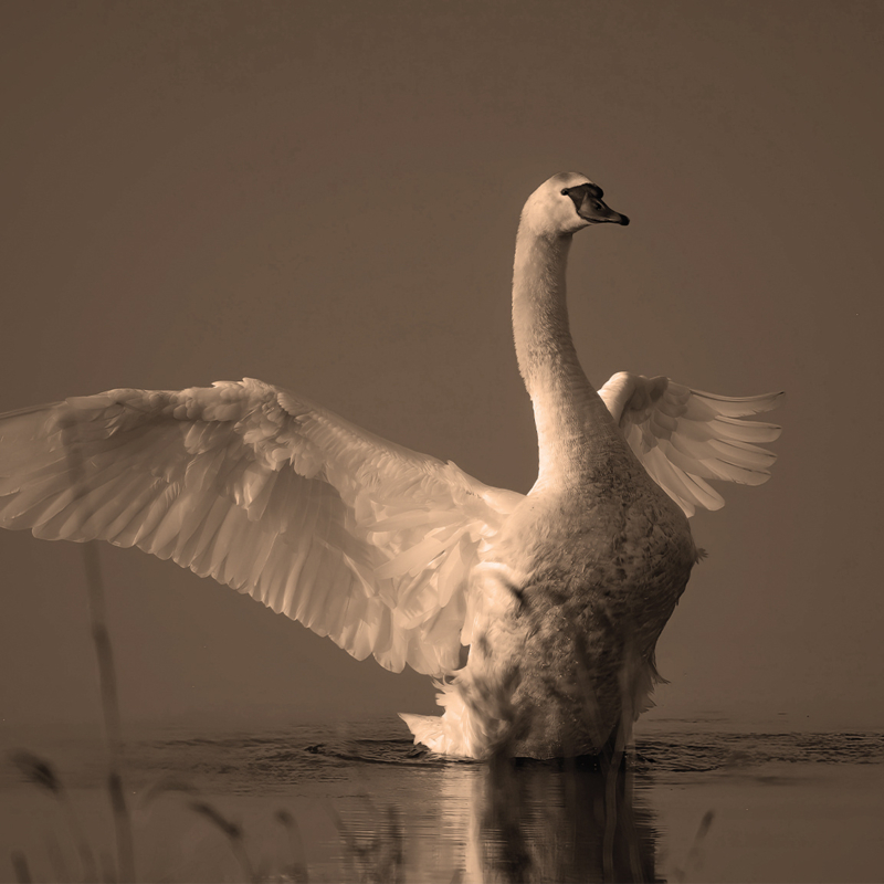 Heel vroeg op de dag is de zwaan op dit viltje op de foto gezet. Hij spreid zijn vleugels wijd open en lijkt de nieuwe dag te willen omarmen. Een koppeltje zwanen is voor hun leven bij elkaar. Zou het daarom zijn dat ze vaak met romantiek worden geassocieerd?