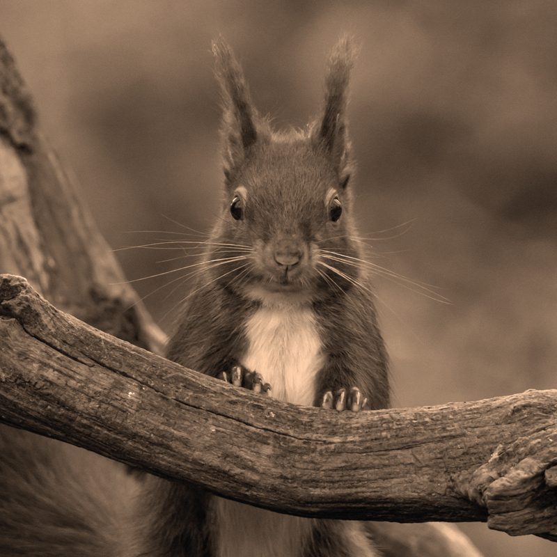 Met zijn zwarte kraaloogjes kijkt de eekhoorn op dit viltje nieuwsgiering in het rond.
