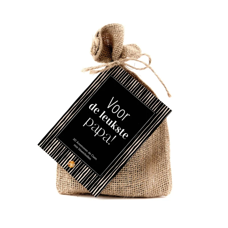 Bloembollen pakket voor de leukste papa kopen? Verras je papa met dit originele en persoonlijke bloembollen cadeaupakket. Dit mooie zakje met tekst “Voor de leukste papa” bevat 20 Anemonen de Caen mix bloembollen én een handige aardetablet.